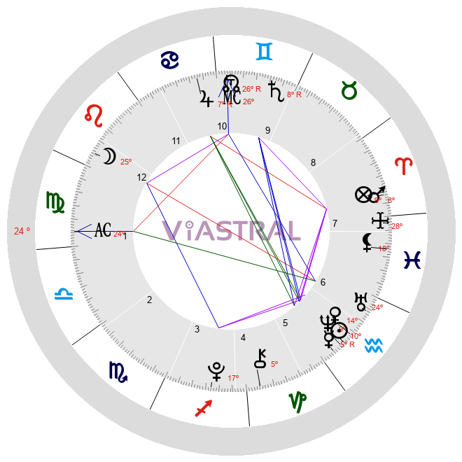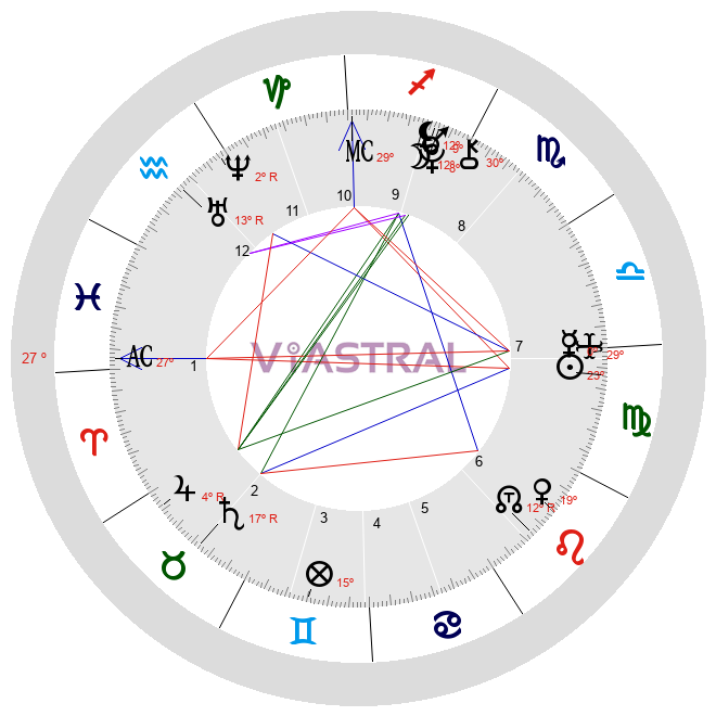 Repare que neste mapa o Sol, que representa a consciência, está em conjunção com Netuno, que é a ilusão, ambos em contato direto com Vênus, que é o prazer, e Mercúrio, planeta da comunicação, todos na casa 5, área da experiência da diversão e do entretenimento.