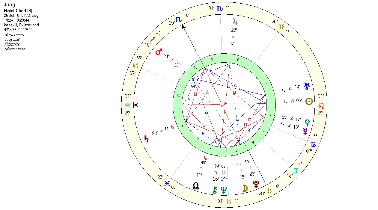 Jung nasceu em 26 de julho de 1875, em Kesswil, uma pequena cidade suíça. Leonino, com ascendente em Aquário e a Lua em Touro, era filho de uma típica dona de casa e de um pastor protestante, com quem tinha sérias divergências sobre religião, o que está indicado em seu mapa pela oposição do Sol com o Ascendente e pela quadratura de Saturno na casa 1 com Plutão na casa 3.