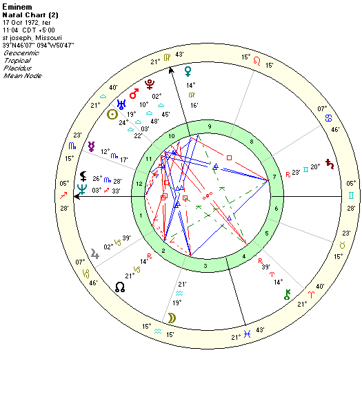 Contrariando todos os prognóticos, Eminem saiu da pobreza para se tornar rapper, transformou dramas familiares em sucessos mundiais, chegou ao topo das paradas, fez carreira no cinema, quebrou recordes e ganhou inúmeros prêmios.Marshall Bruce Mathers III, conhecido mundialmente como Eminem, cantor, compositor e produtor, nasceu em St. Joseph, no Missouri, às 11h04 do dia 17 de outubro de 1972. Ele é de Libra, mas sua imagem é de um artista transgressor, seu estilo é contundente, suas músicas têm letras agressivas, com temas controversos, o que pode ser associado ao ascendente Sagitário, a Mercúrio em Escorpião e Plutão na casa 10.