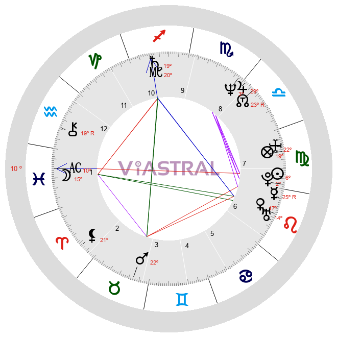 A relação traumática com o pai, que exerceu dominação sobre ele até a vida adulta, é claramente indicads em seu mapa por Saturno no meio do céu em quadratura com a Lua no ascendente, ascendente que também recebe a oposição do Sol.